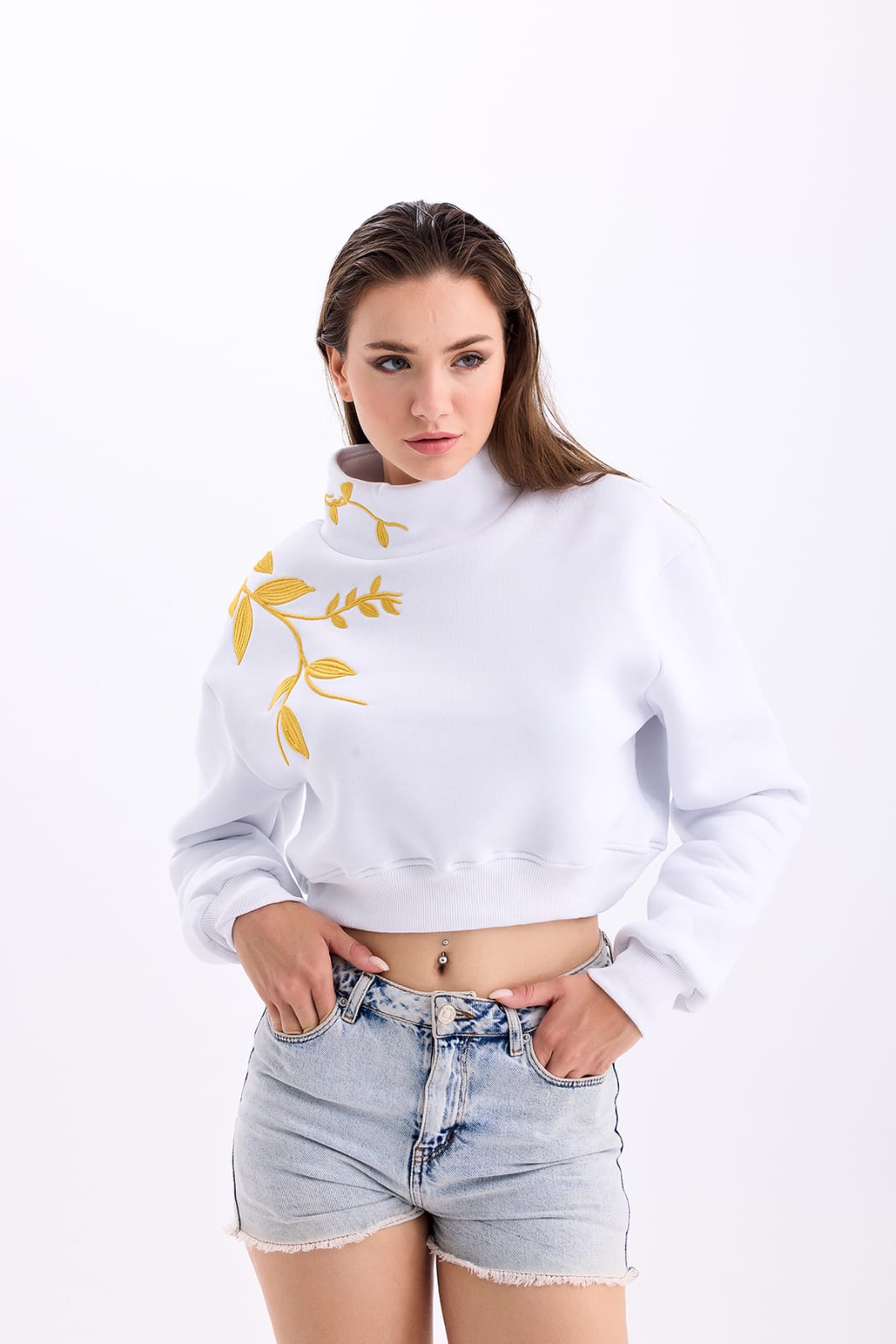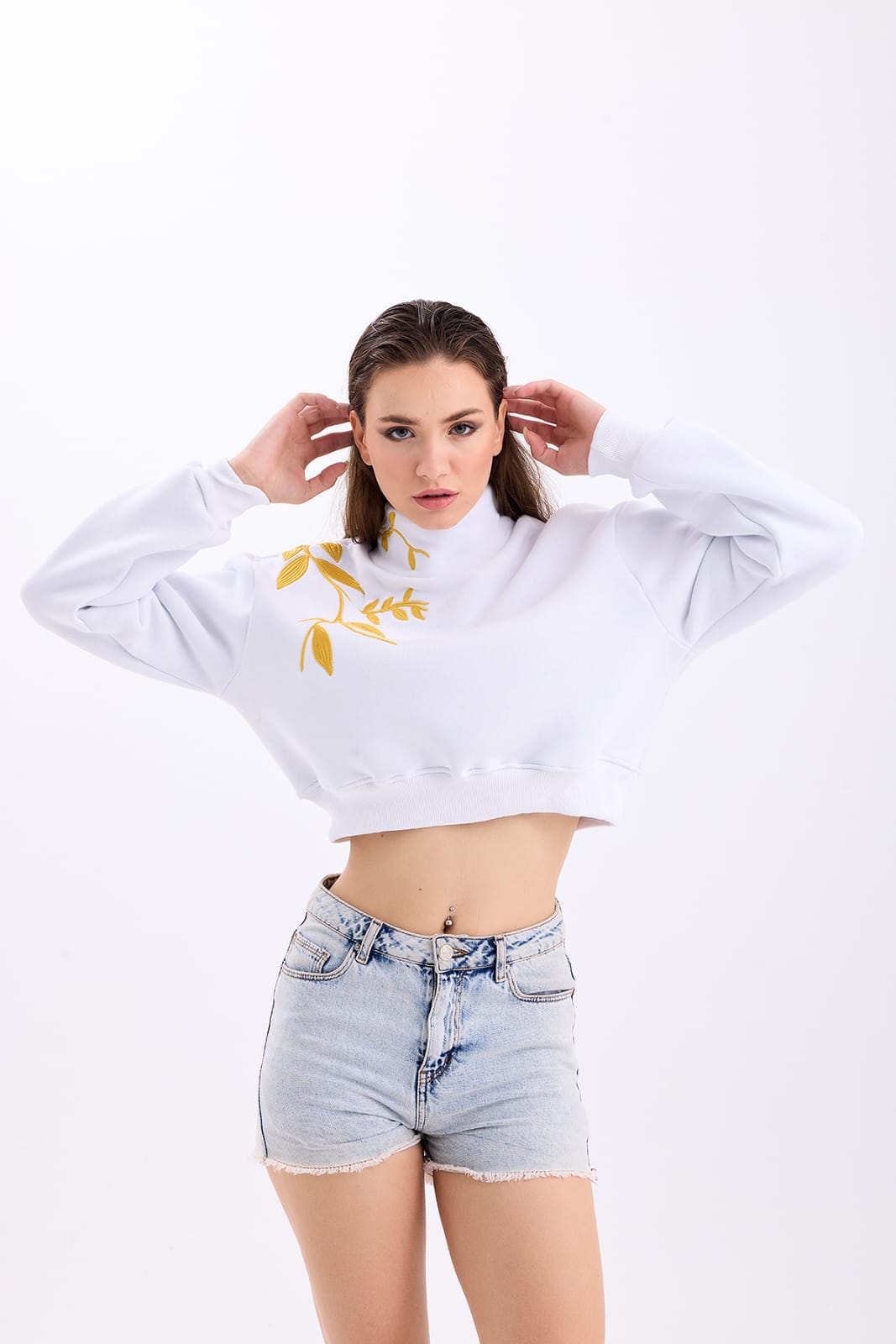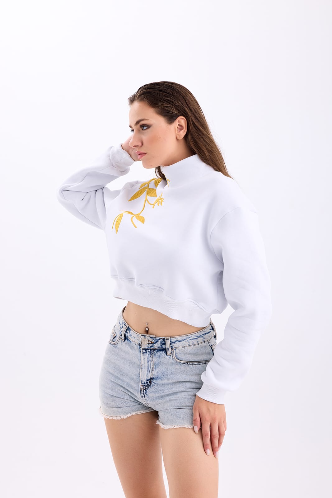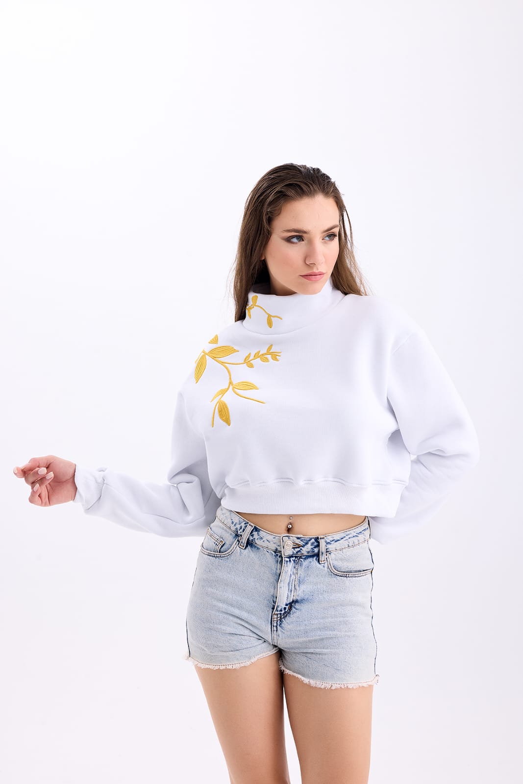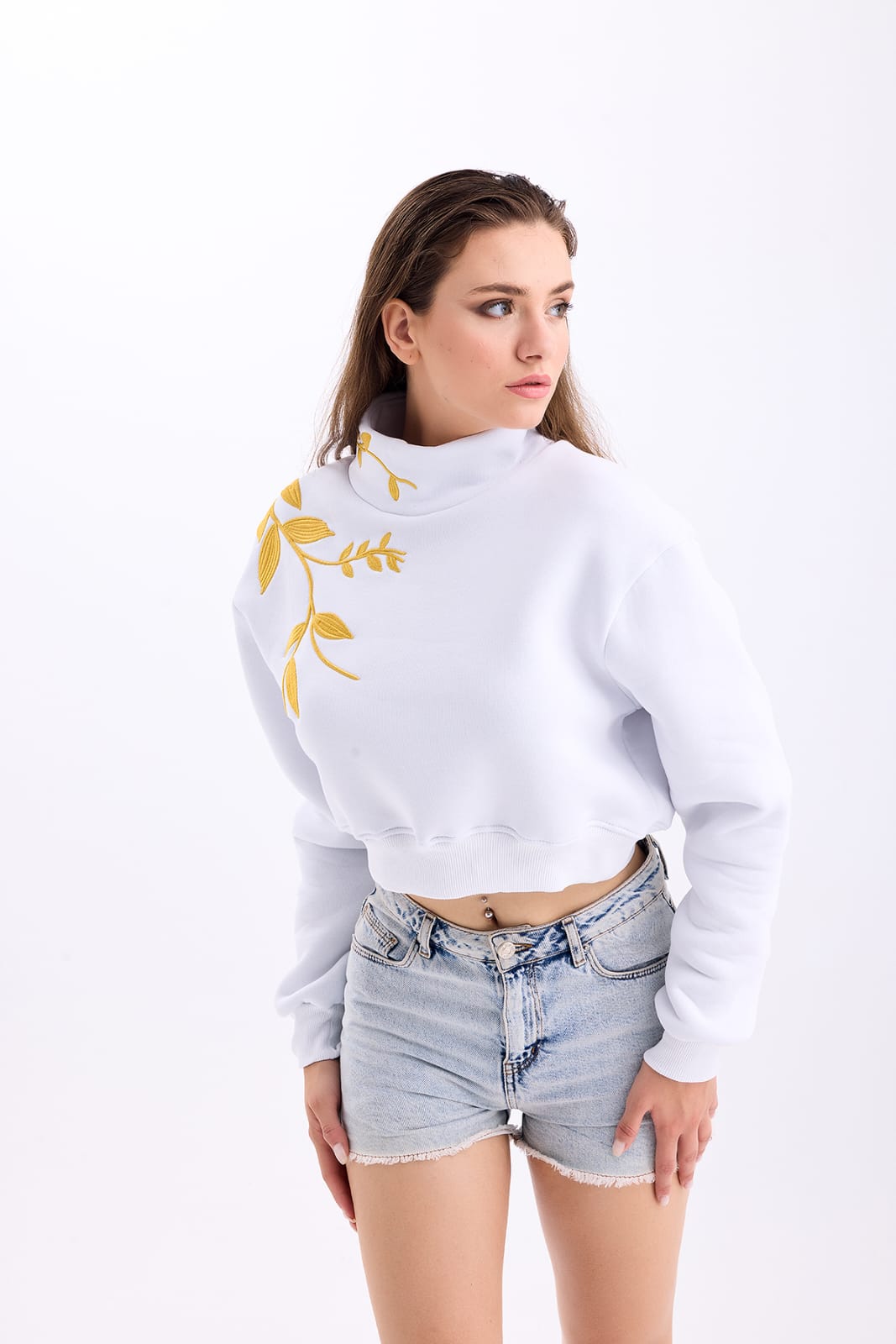Beyaz Kadın Nakışlı Crop Sweatshirt, sade şıklığıyla stilinizi güçlendirirken gün boyu rahatlık sunan joker bir parçadır. Gardırobunuza modern bir dokunuş eklemek istiyorsanız bu sweatshirt tam size göre!