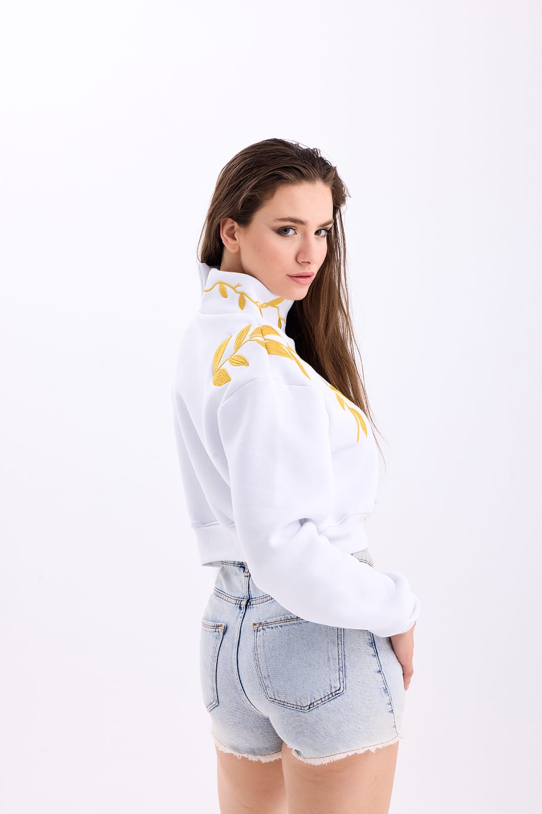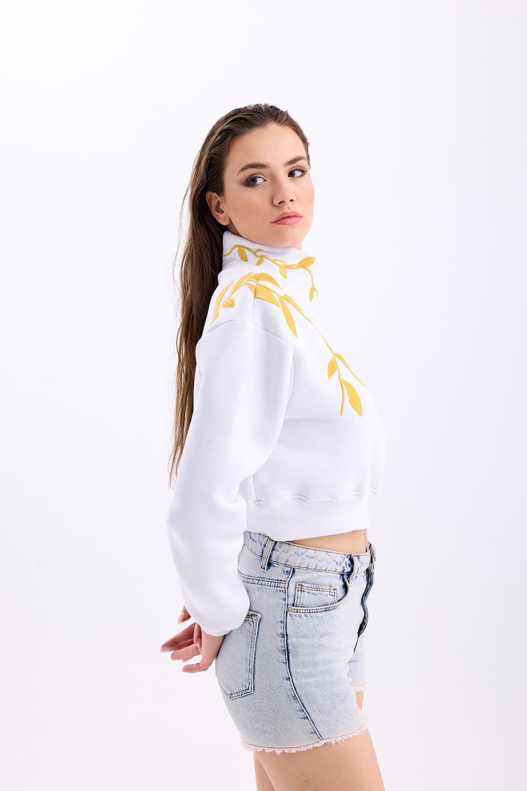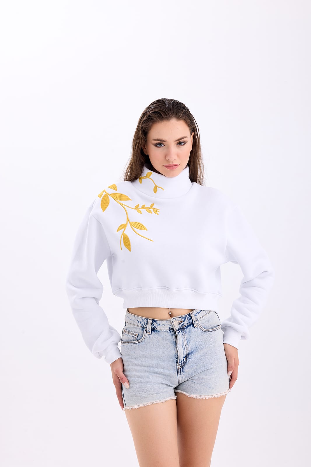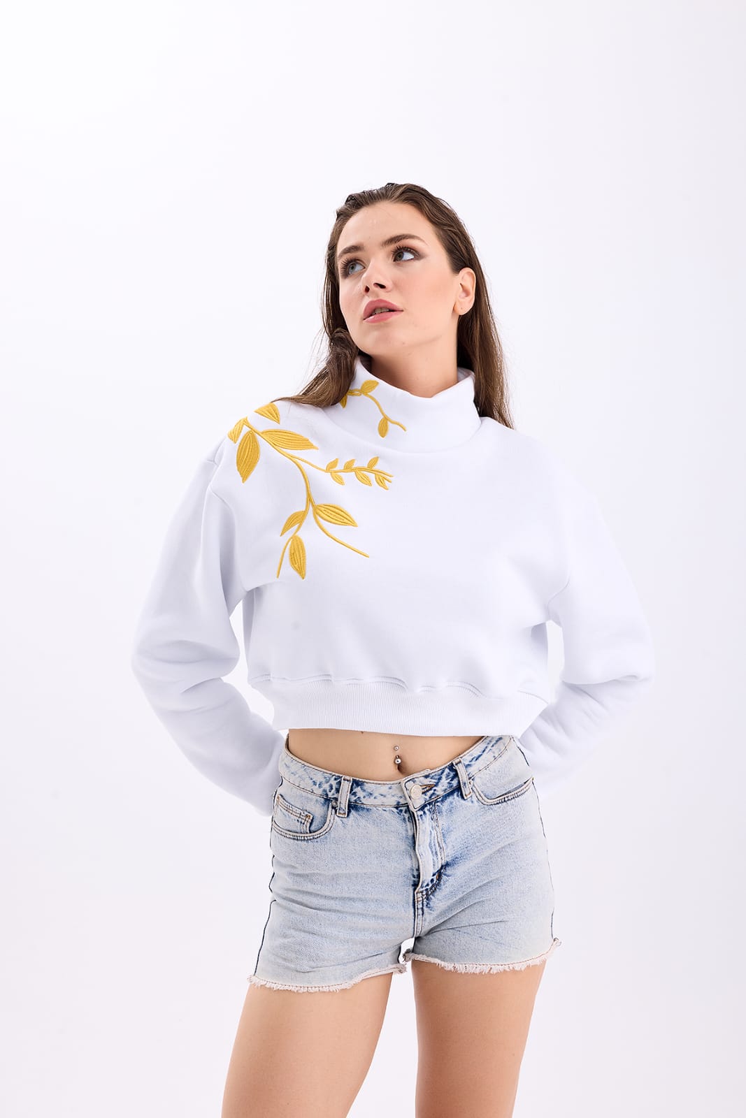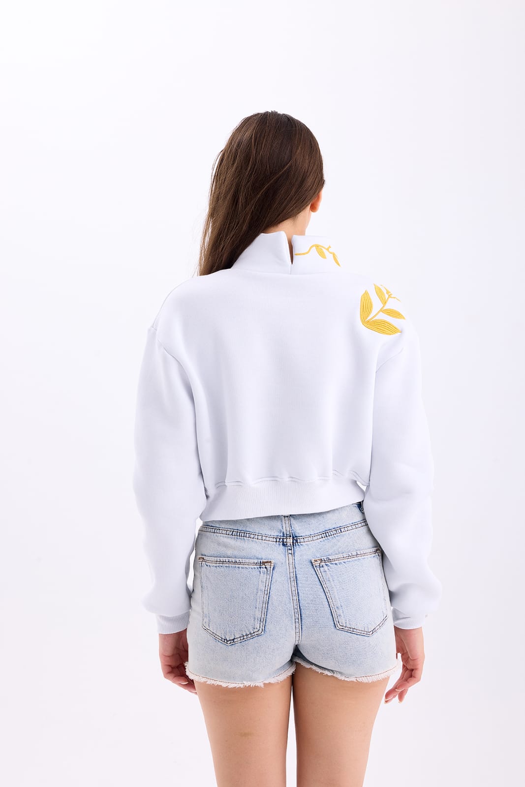 Beyaz Kadın Nakışlı Crop Sweatshirt, sade şıklığıyla stilinizi güçlendirirken gün boyu rahatlık sunan joker bir parçadır. Gardırobunuza modern bir dokunuş eklemek istiyorsanız bu sweatshirt tam size göre!