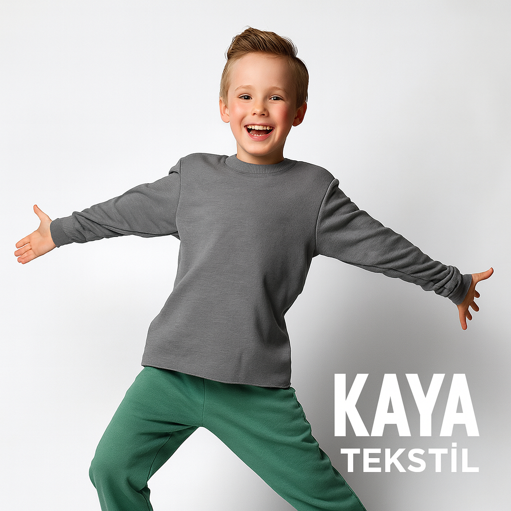 Kaya Tekstil olarak, çocuklara özel bisiklet yaka, sıfır yaka ve polo yaka sweatshirt üretimini siparişe göre toptan olarak gerçekleştiriyoruz. Baskılı, nakışlı, logolu veya tamamen basic modellerde, markanızın ihtiyaç duyduğu tüm çocuk sweatshirt modelleri profesyonel üretim hattımızda hazırlanır.